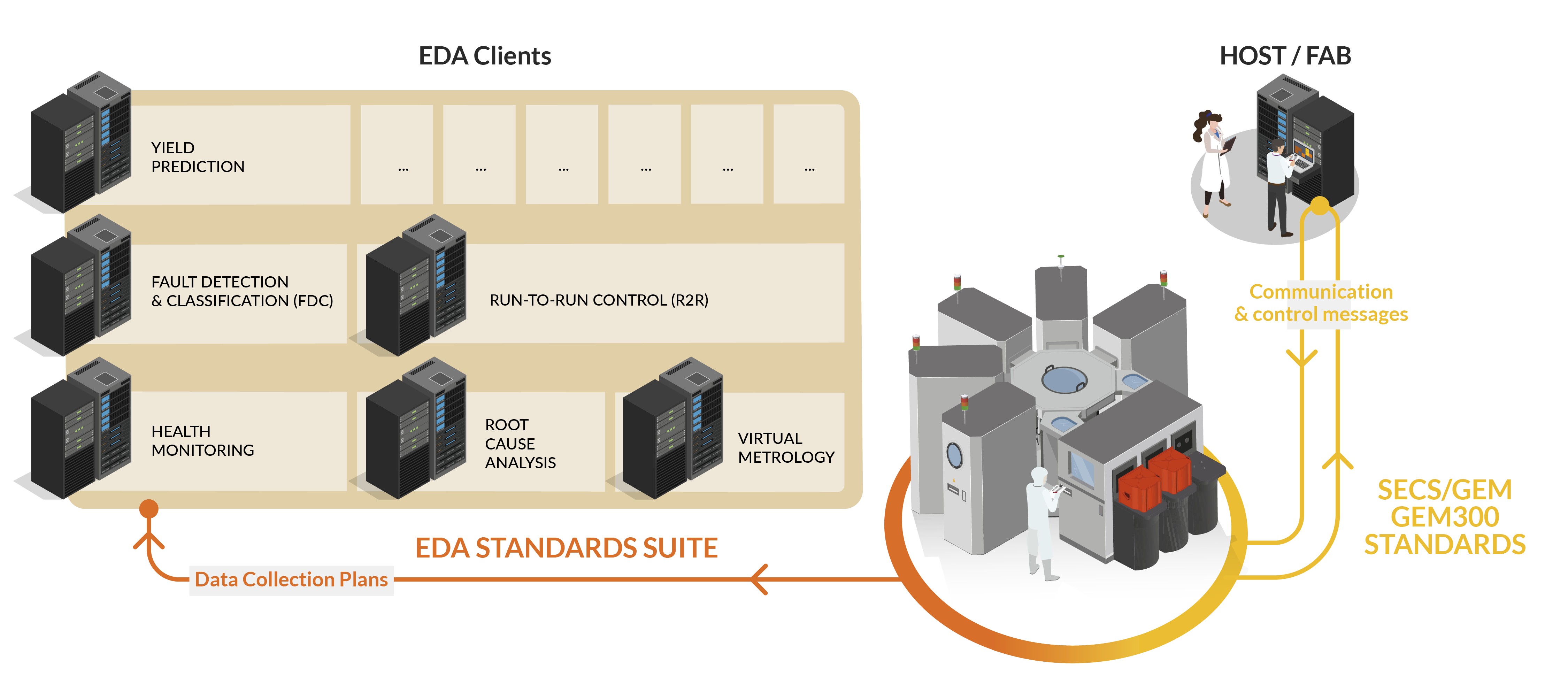 EDA ist ein Satz von SEMI-Standards (häufig als Interface A bezeichnet) für den Datenaustausch zwischen Halbleiteranlagen und Fabriksystemen. Es liefert strukturierte und hochfrequente Daten von Werkzeugen und ergänzt SECS/GEM durch sichere Kommunikation und fortschrittliche Datenmodellierung.